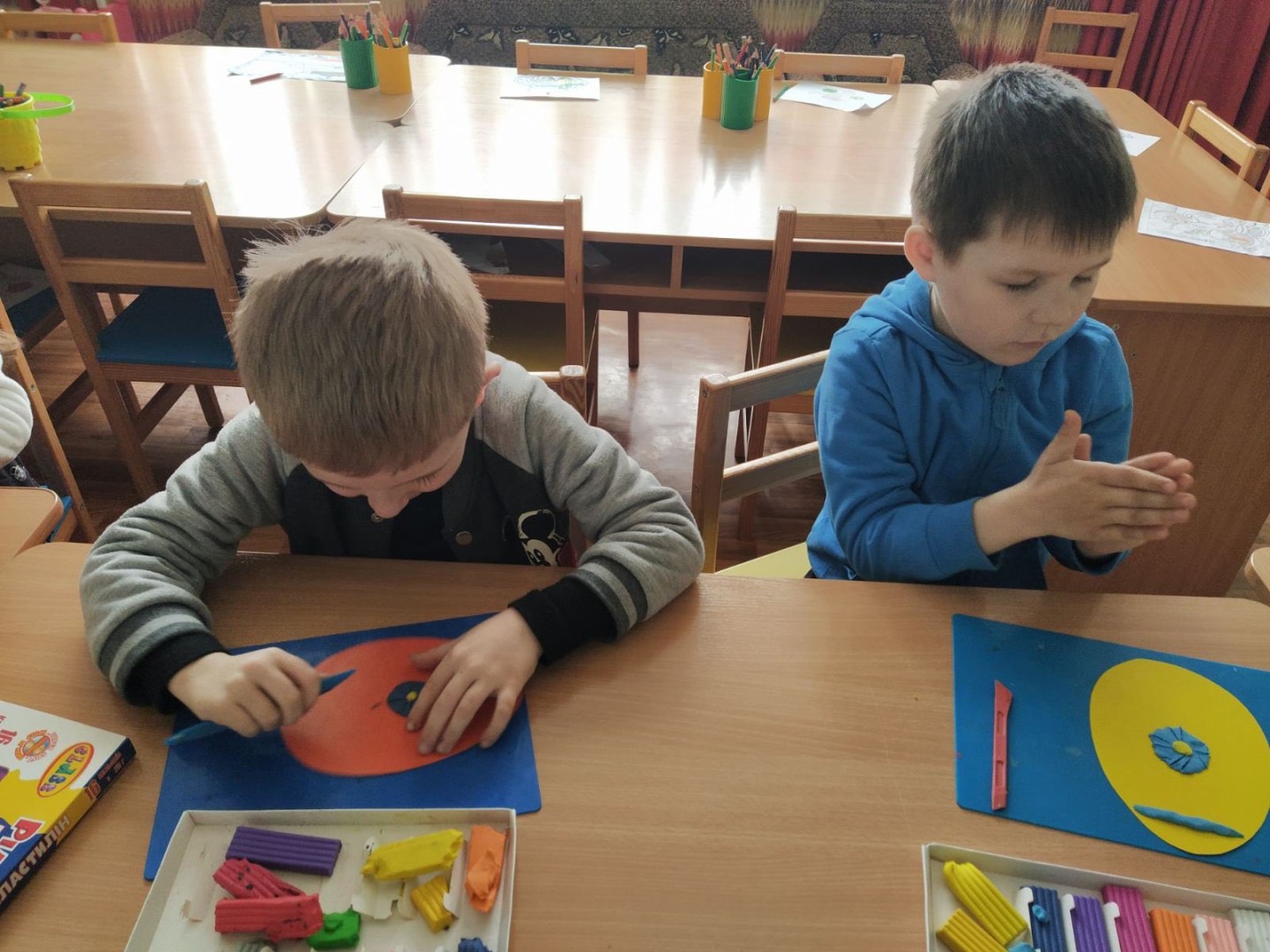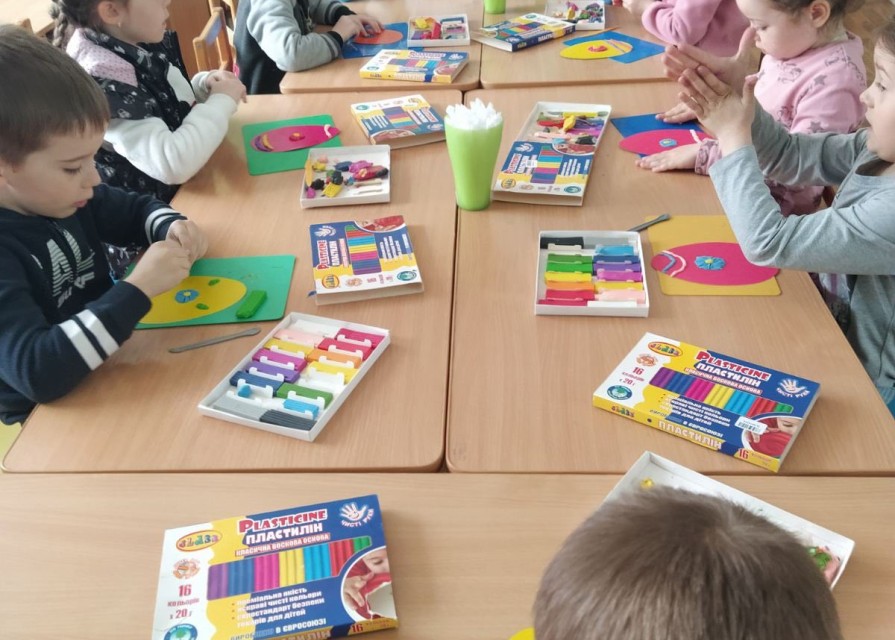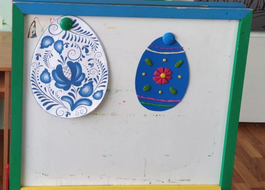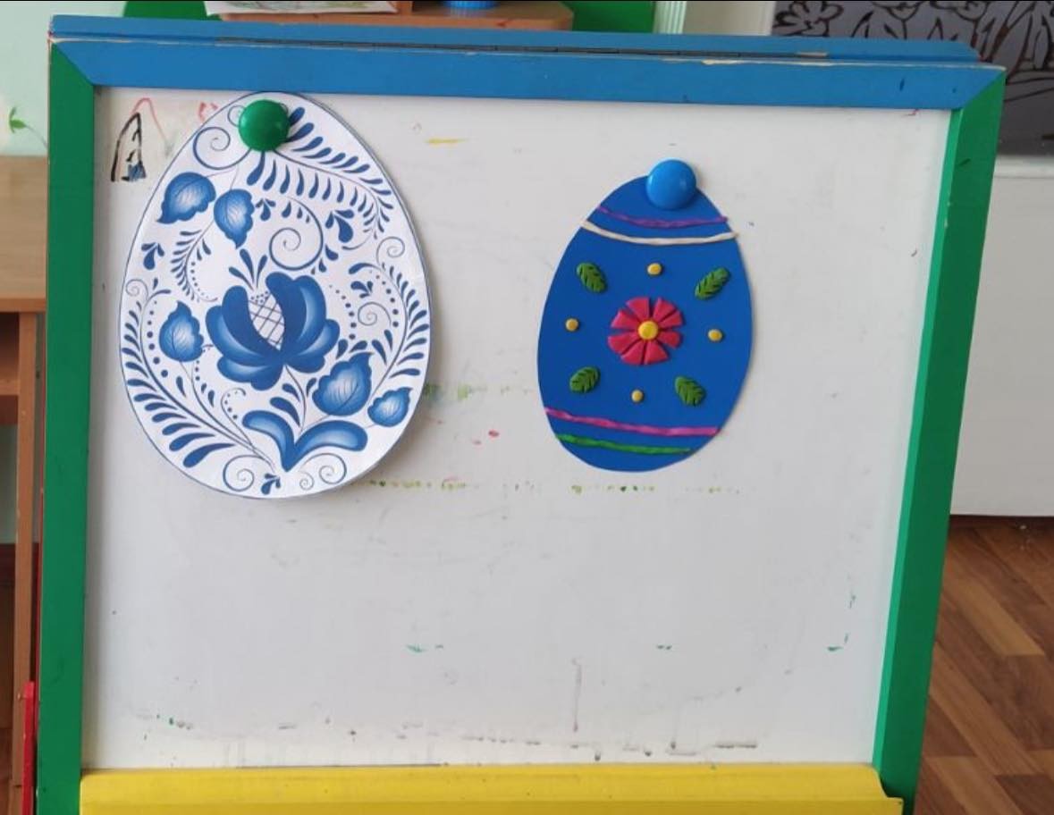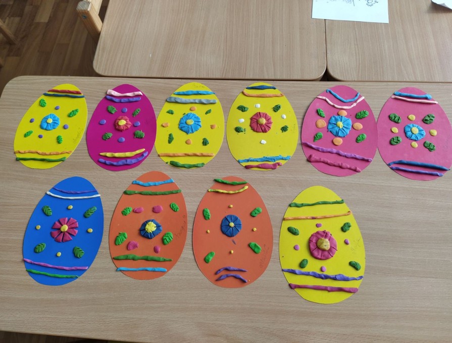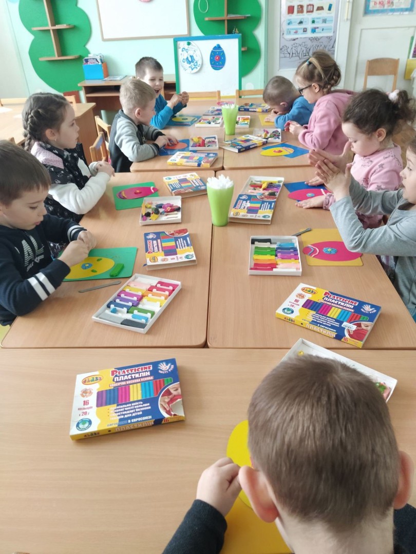 Мета: продовжувати розширювати знання дітей про походження великодніх обрядів та традицій; розширювати навички виконання робіт із пластиліну, навчати оздоблювати вироби орнаментами та візерунками; сприяти розвитку вміння створювати цікаву композицію; розвивати асоціаційне сприйняття кольорів, зорову пам'ять.